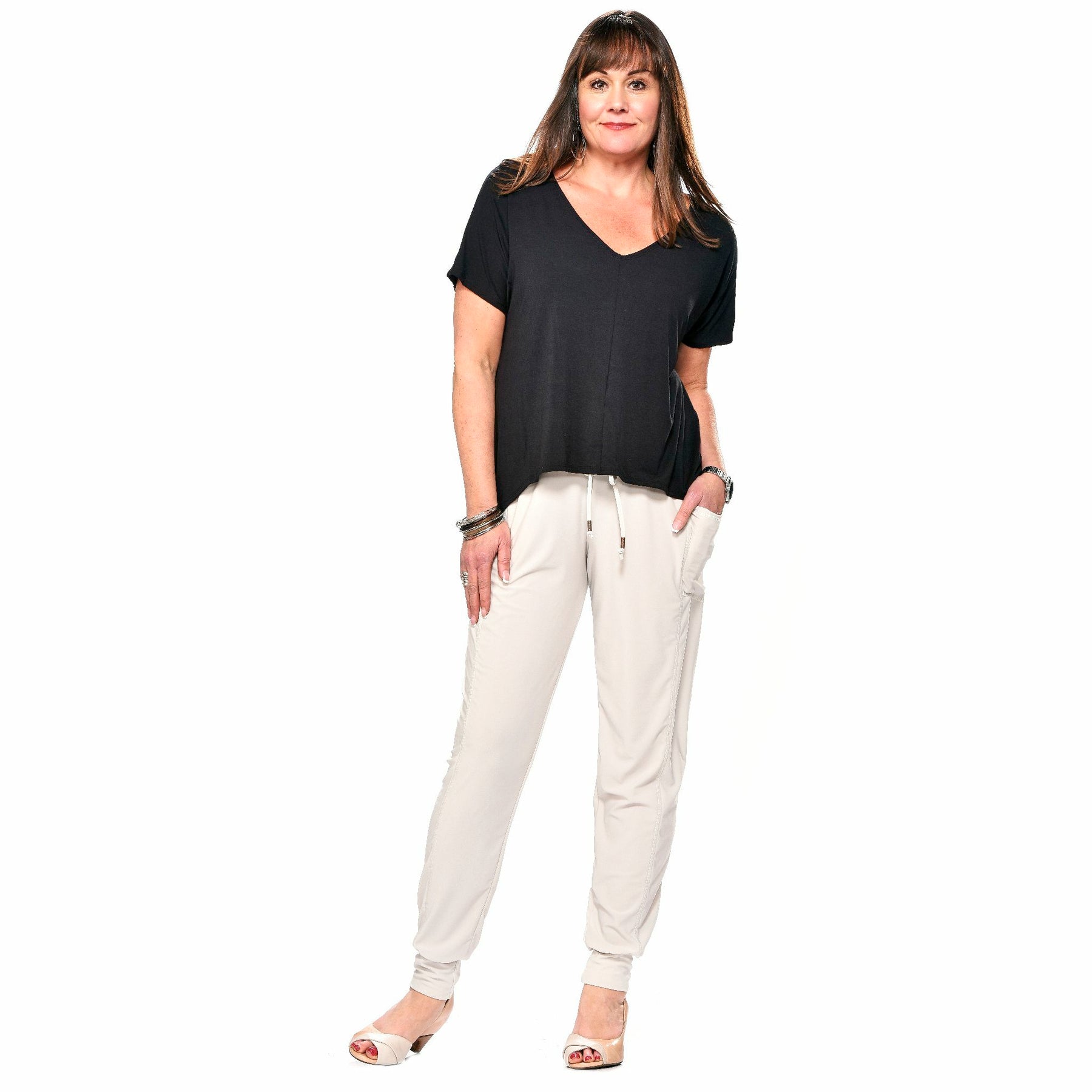 Perfect for lounging, working from home, yoga and casual days out, these fabulous drawstring pants are made in a soft lightweight knit, with pockets and a jogger cuffed bottom. A drawstring waist customizes your fit. Plus sizes available, and made in Canada by Rapz Lifestyle Clothing.